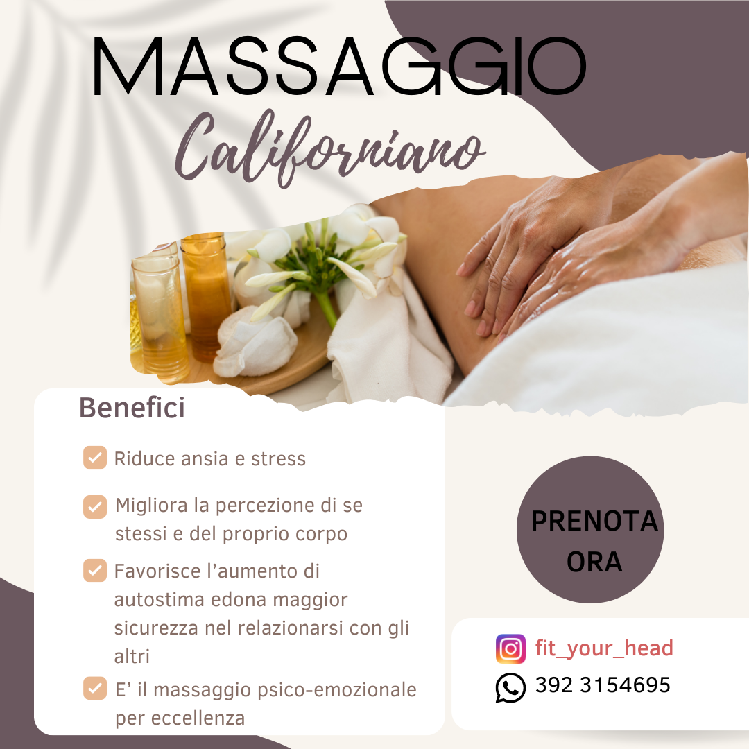 Il Massaggio Californiano è considerato il RE dei massaggi psico-emozionali, ed è spesso associato alla psicoterapia in quanto, con il suo tocco leggero, armonioso e avvolgente, ti aiuta a prendere piena consapevolezza del tuo corpo insegnandoti cosi ad amarlo.